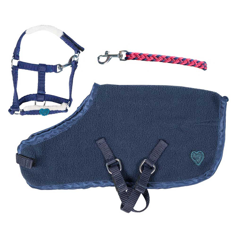 La longe tressée, aux couleurs bleu marine et rouge, complète parfaitement le licol pour permettre aux jeunes cavaliers de guider leur monture comme de vrais petits palefreniers. La couverture douce se ferme facilement avec du velcro, pour un habillage rapide et sans difficulté, même pour les petites mains.