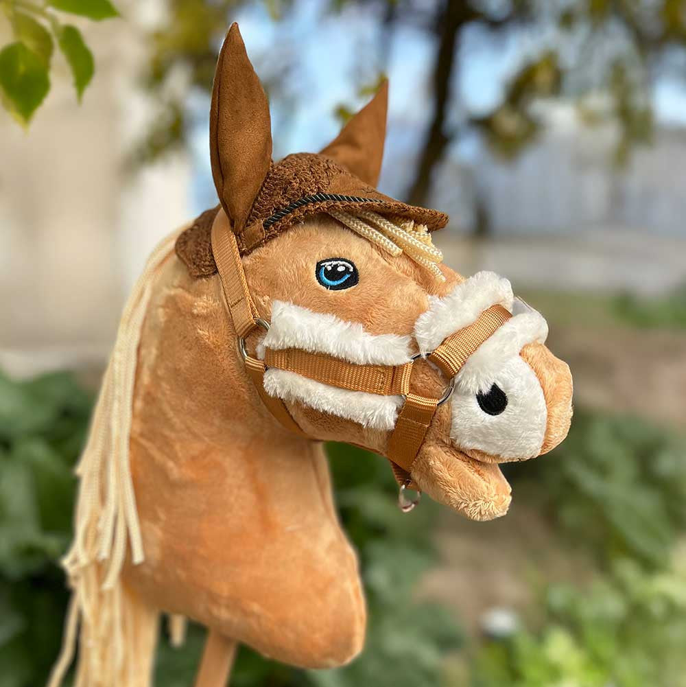 Un bonnet anti-insecte caramel de la marque Lemieux : Élégant et pratique, il protège ton hobby horse des petites bêtes et s’accorde avec le reste de l’ensemble.